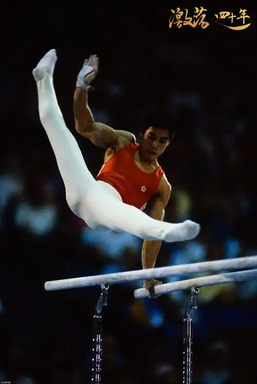图为1984年第23届奥运会,李宁在男子自由体操比赛中以19.