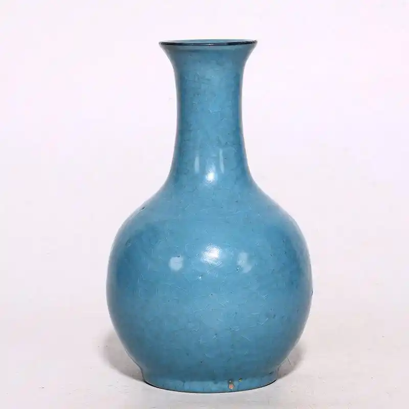 北宋宝丰天蓝釉蝉翼纹开片铭文官汝窑鹅颈赏瓶 古董 博藏级别