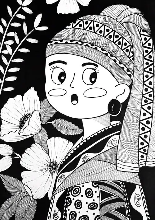 黑白装饰画名画转线描戴珍珠耳环的少女