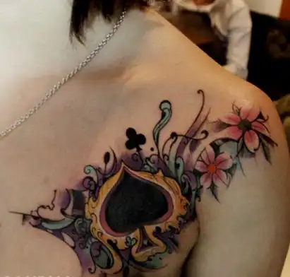 女性胸部花卉和黑桃纹身