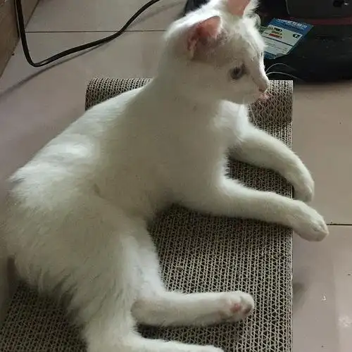 纯白小土猫,上一年9月15日出生,当时猫妈大雨瓢泼产子,又笨又斯文,在