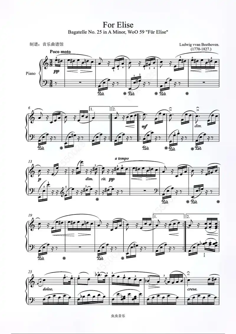 《致爱丽丝,钢琴谱》贝多芬(五线谱 钢琴曲 指法)-弹吧|蛐蛐钢琴网
