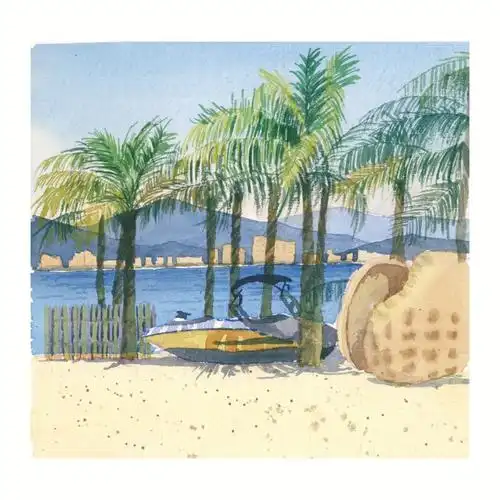 手绘海滩帆船背景水彩手绘夏威夷海滩背景水彩风景画大海海边风景图片