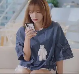 你微笑时很美程潇童谣同款蓝色t恤蝴蝶结小熊上衣水洗牛仔衣服短