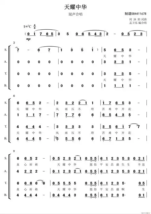 庐州月四声部混声合唱简谱钢琴伴奏五线谱
