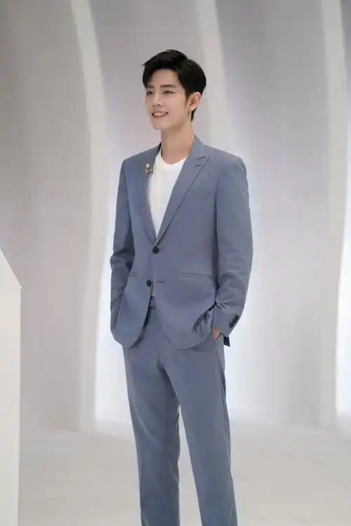 肖战身穿蓝灰色西装套装面露微笑绅士帅气