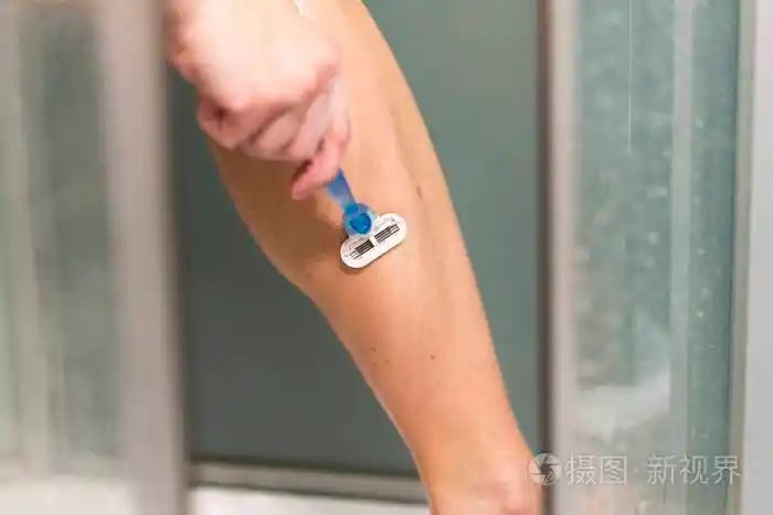 性感的年轻女人在浴室里刮腿毛.使用剃须刀的女性腿部特写镜头.