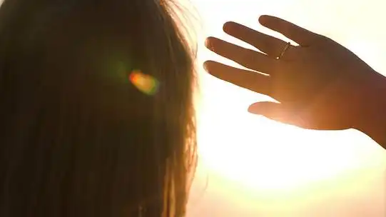 回来的女人望着远方躲在阳光下,用一只手的特写镜头