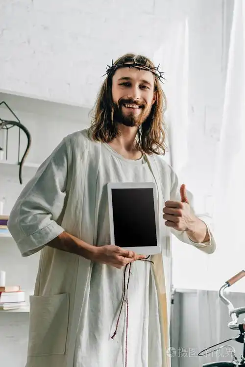 快乐的耶稣在荆棘王冠上做拇指手势, 并显示在家里的空白屏幕数字平板