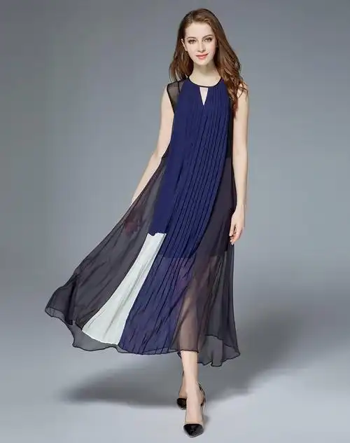 蓝黑色无袖圆领优雅修身高端气质真丝连衣裙