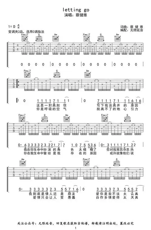 蔡健雅《letting go吉他谱》c调原版吉他谱