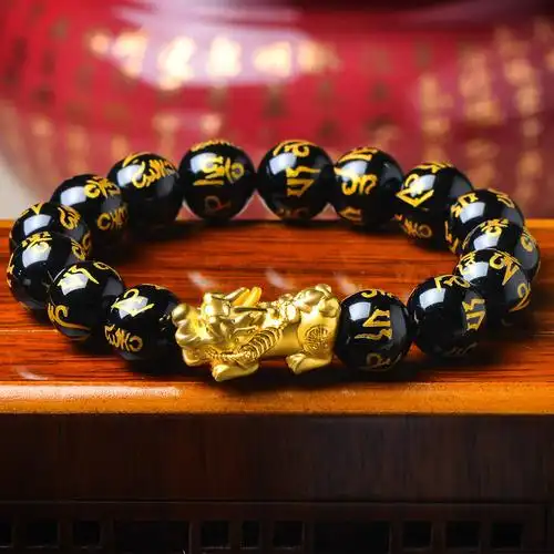 蒂蔻 大版貔貅黄金手链男士款本命年足金六字箴言黑玛瑙路路通手串自