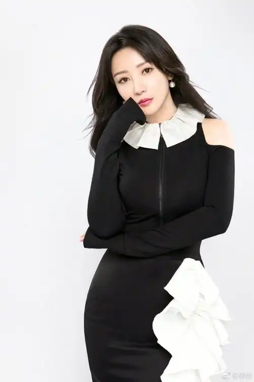 照片中,柳岩一头波浪大卷妆容精致,身穿一身黑白拼色礼服,对着镜头