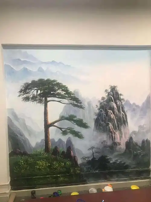 保定墙体彩绘 山水迎客松彩绘步骤