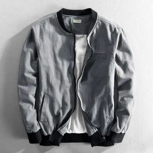 简约棒球领休闲棉麻夹克男士夏季宽松青年水洗纯色拉链亚麻布外套