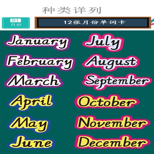 英文单词板书卡片黑板教师词条教具 月份单词卡12张塑料更耐用不含
