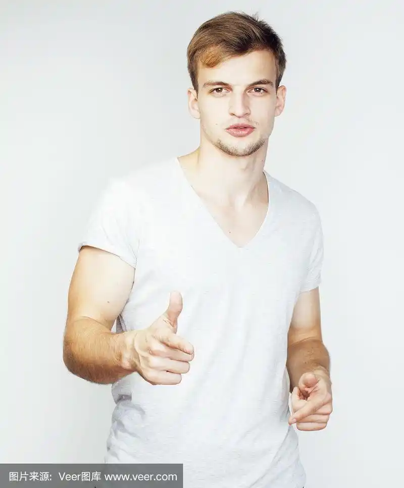 年轻帅气的男子在白色背景上打手势,指指点点,摆姿势动情