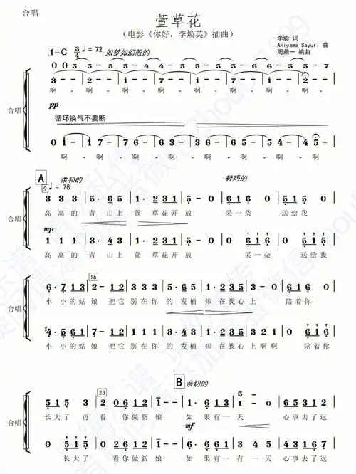 《萱草花》简谱 《萱草花》是由akiyama sayuri作曲,李聪作词张小斐