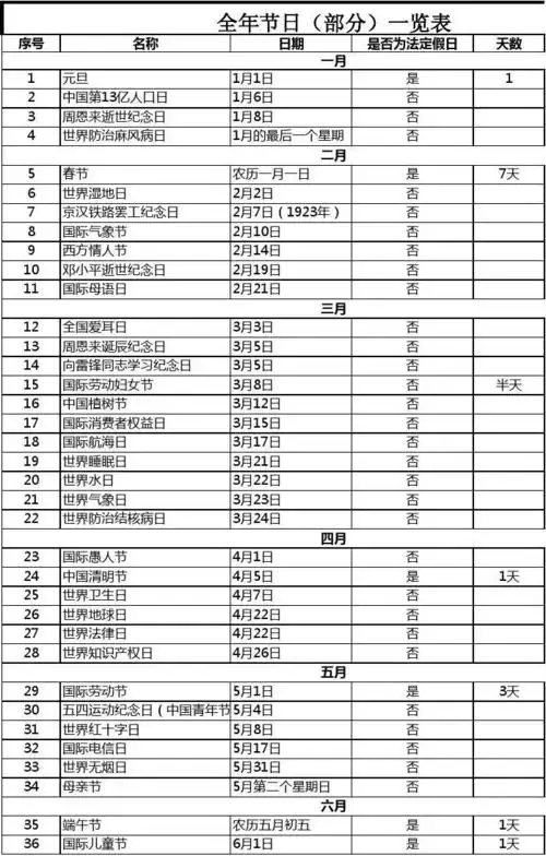 全年各个节日(部分)一览表