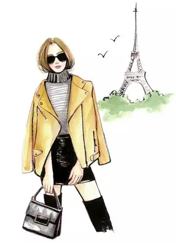 手绘坐在咖啡厅里喝咖啡的时尚美女