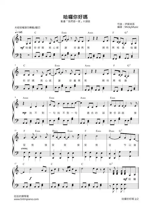 哈罗你好吗动画我们这一家片头曲钢琴独奏谱附歌词及和弦内含原调g