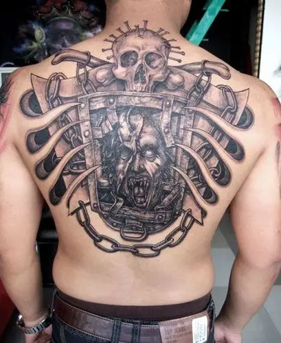 满背抓着骷髅的恶魔纹身图案