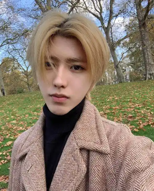 依旧是蔡徐坤标志性的三七分刘海,是很有造型感的短发,砂金色的靓丽发