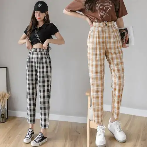 秋壳格子裤女夏薄款棉麻高腰直筒显瘦哈伦裤百搭休闲裤格纹萝卜裤