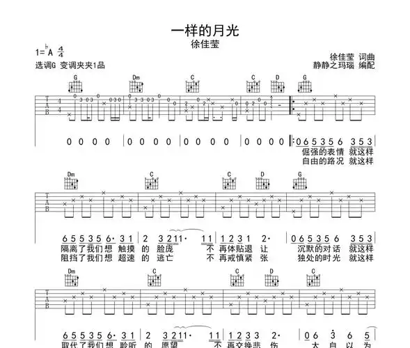 一样的月光吉他谱_g调_徐佳莹_弹唱六线谱1