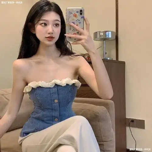夏季新款复古一字肩抹胸露背系带牛仔上衣女大品牌原单尾货纯棉少女