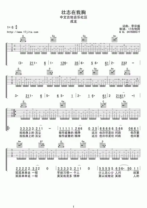 壮志在我胸吉他谱 _成龙_g调_吉他弹唱谱1
