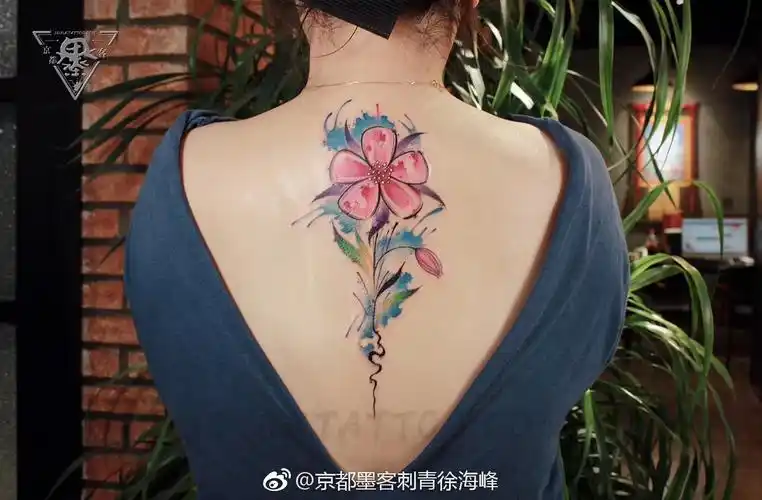 女生花卉水彩背部纹身图案