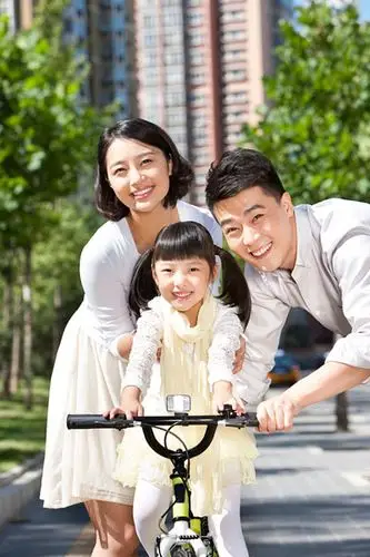 爸爸妈妈教女儿骑自行车