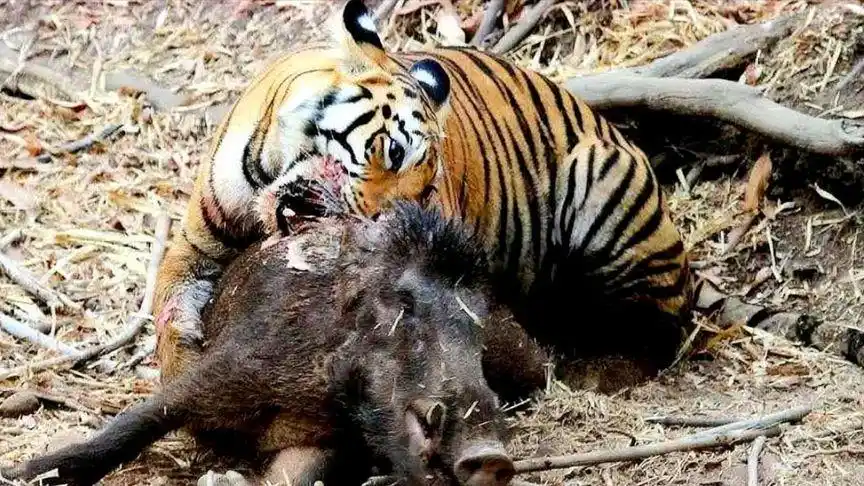 老虎真不愧是百兽之王,虐杀只野猪几乎分分钟的事,最后一招漂亮