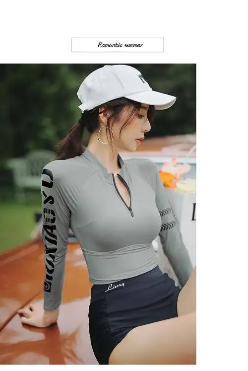 ins韩国游泳衣女长袖分体运动风三件套聚拢保守比基尼学生游泳装