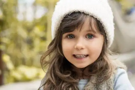 漂亮的小黑发女孩蓝眼睛一个可爱的小4岁小孩戴帽的户外肖像, 秋季