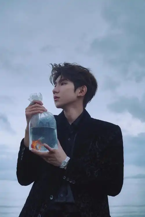 王源黑色暗影西装造型##王源抱着金鱼拍照