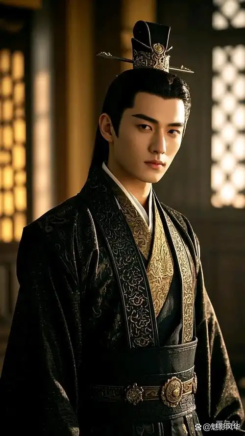 在一座古雅的庭院中,一位帅气男子气概的小哥哥身着华丽的袍服