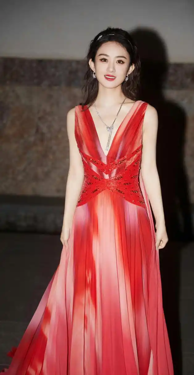 赵丽颖,粉红渐变色深v长纱裙,优雅时尚,美丽动人!