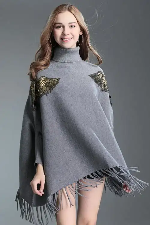欧美亚马逊钉珠刺绣斗篷披肩女蝙蝠衫中长款高领毛衣套头针织衫