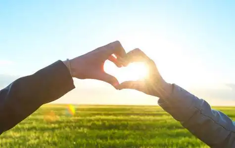 浪漫的情侣在日落打手势用手指一颗心的爱照片
