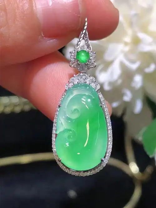 天然翡翠a货冰种18k金飘阳绿如意吊坠挂件