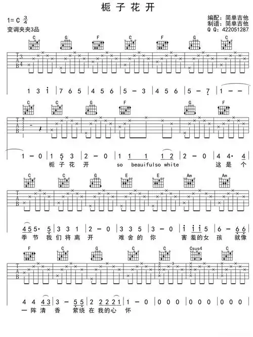 栀子花开(吉他六线谱)简谱歌词