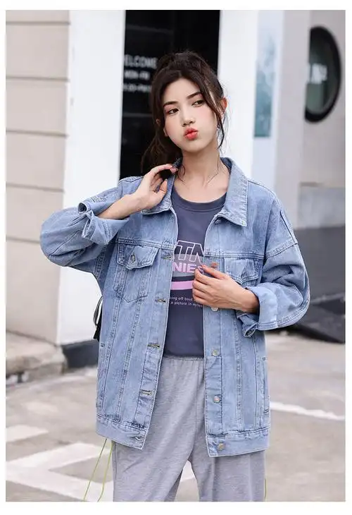 外套女宽松韩版中长款春秋2021年新款bf上衣潮ins百搭牛仔衣浅蓝色l