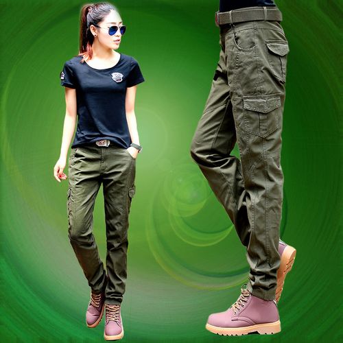 勒足纯棉休闲裤女多口袋工装裤显瘦长裤宽松军绿色裤子 26码