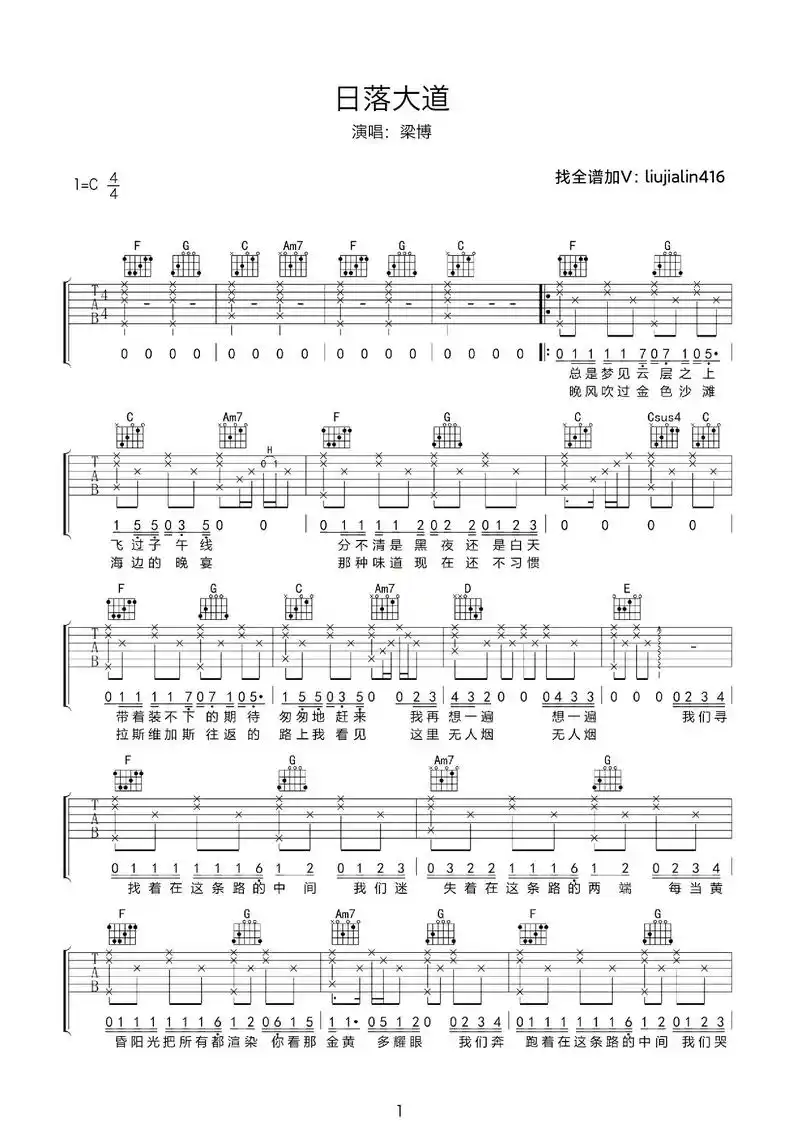 日落大道吉他谱原版梁博歌曲简单c调弹唱教学找谱如此简单版六线指弹