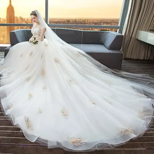 香槟色大拖尾婚纱 春季显瘦一字肩蕾丝,超大裙摆,颜色香槟色