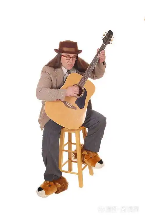 快乐的音乐家穿着棕色夹克和帽子弹吉他照片-正版商用图片27vpv5-摄图