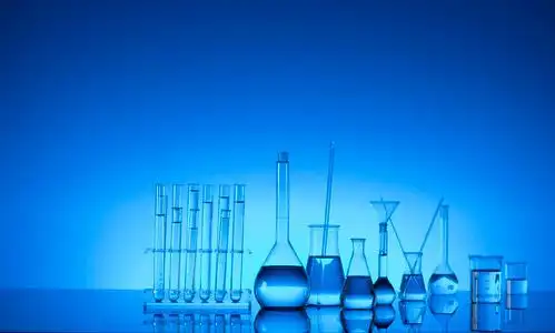 科学实验室.实验室玻璃器皿, 试管.研究开发.蓝色背景照片