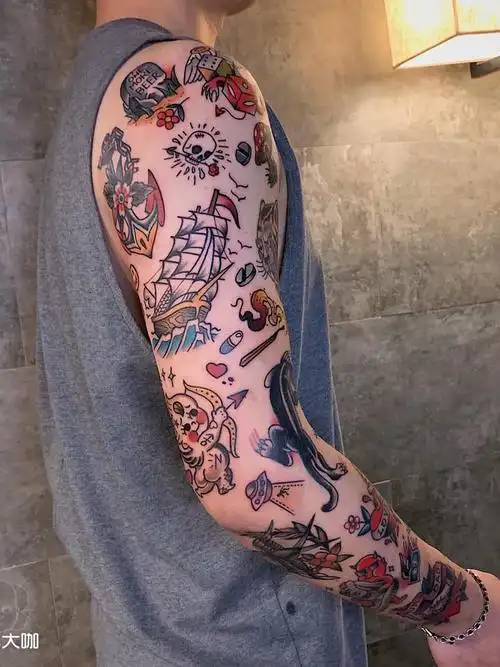 完整拼接花臂纹身图片手臂oldschool欧美彩色花臂拼接纹身图案